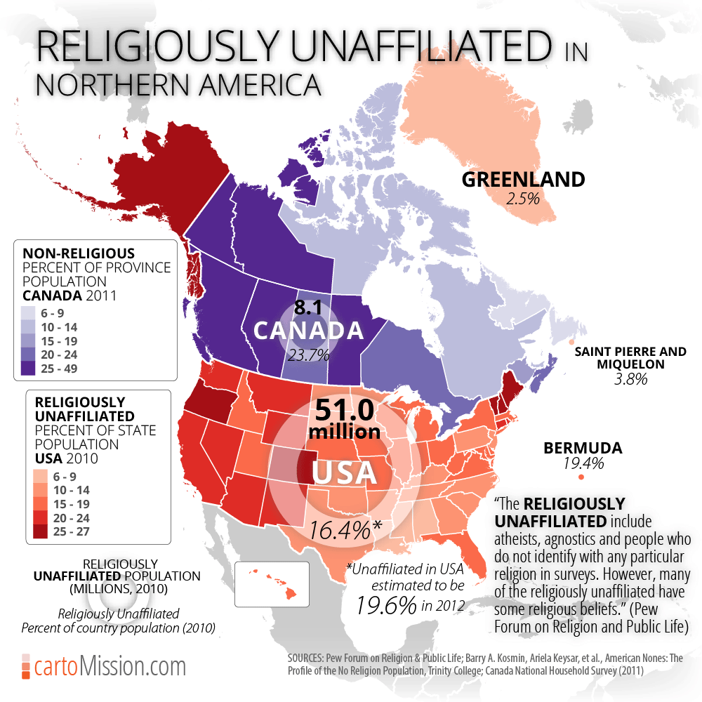 The map above shows the percentage of each country’s population that is religiously unaffiliated, as well as the total number in the U.S. and Canada. Also, the percent unaffiliated by state (U.S.) and the percent non-religious by province (Canada) are shown. The top states in the U.S. are Alaska, Oregon, New Hampshire, Vermont, Colorado, and Maine. The top provinces in Canada are Yukon, British Columbia, Alberta, Northwest Territories, and Manitoba.