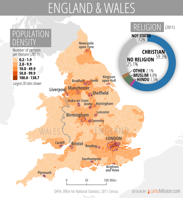This map shows the population density of England and Wales with data from the 2011 Census. The 20 largest cities are labeled and outlined. The local authorities with the highest population densities are found in and around London in the southeast of England.
