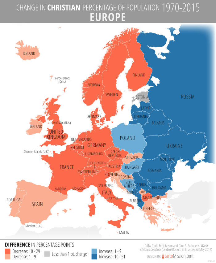 Of the 49 countries in Europe, Christianity decreased in 33 countries as a percentage of population by at least 1 point from 1970 to 2015. This is according to data from the World Christian Database. The decrease in Christian percentage occurred in all of the nine countries of Western Europe, 10 of the 13 countries of Northern Europe, 12 of the 17 countries of Southern Europe, and two of the 10 countries of Eastern Europe. The largest decreases were found in the Netherlands, Czech Republic, Belgium, Austria, and Germany.